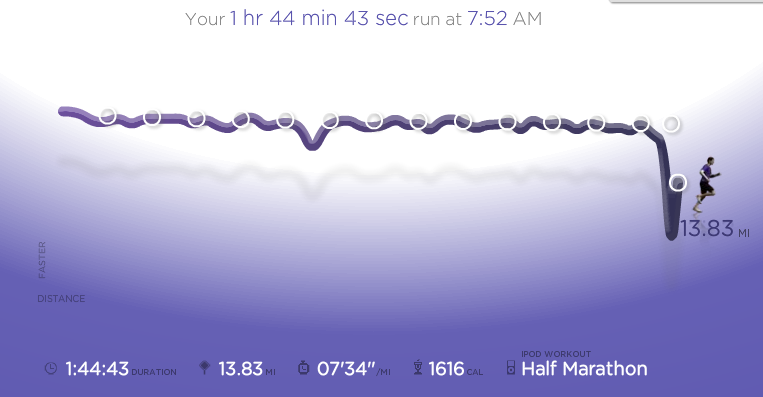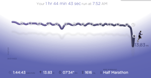 I had just landed after 34 hours flights from the other side of the world (ya… the holy land). It wasn’t the best way to start a long run, but that’s life. After the first mile, I felt good so I’ve push and the first 6miles where in less then 40min (too fast for me). In that point of the race, I thought it’s going to be an easy sub 1:30 half… however, the body and specially the legs thought they need more rest, and then next 6.1mile where slower and slower up to 7:28 per mile. I’ve finished around 1:40. Well, you better start in a pace you can keep… and try not after long flights.