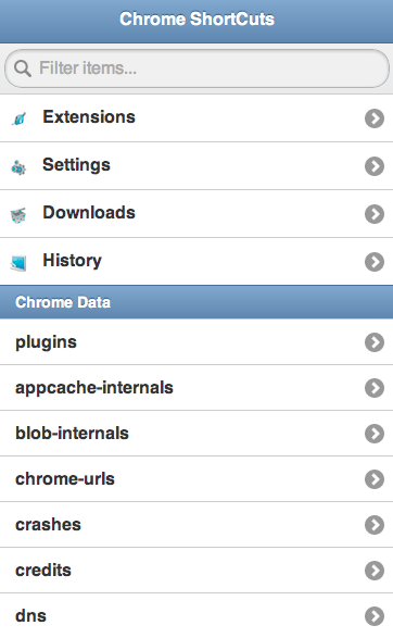 We will take for example the case of opening some Chrome internal pages. I’ve wrote this extension more then a year ago because I wanted ‘one-click’ from many interesting internal pages that chrome give developers that want to have a look at some internal parts. For example: