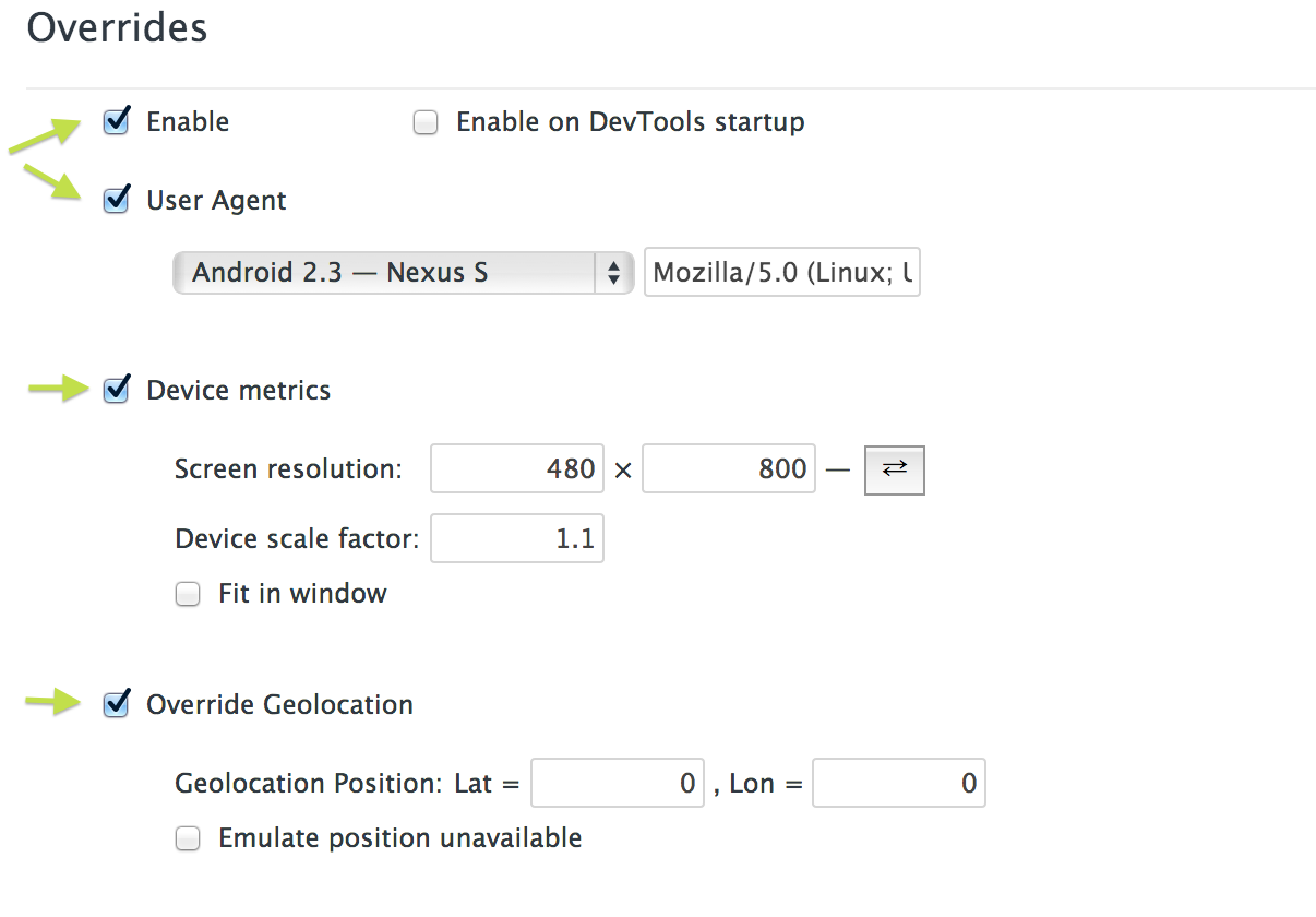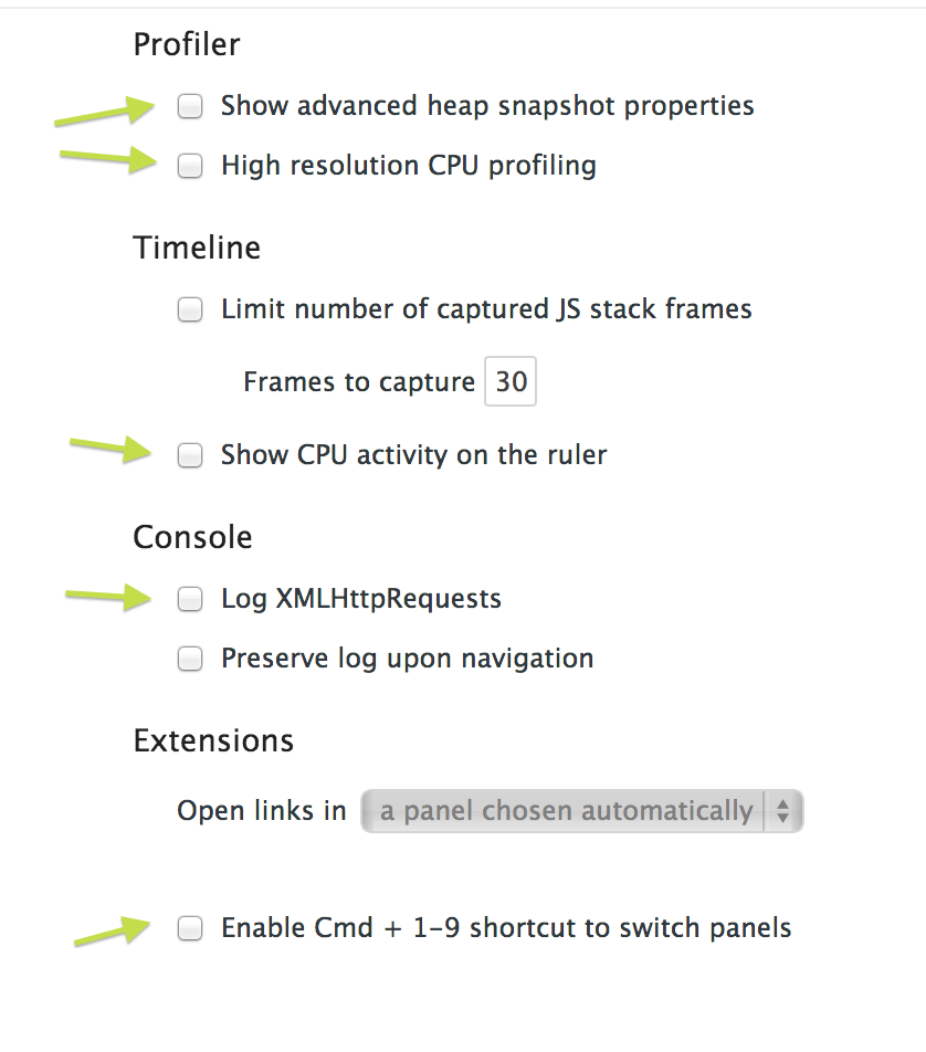 (!) If you are a front-end developer you should use Google Chrome Canary. It is easy to install it side by side your regular Chrome and it will give you the latest and greatest features with frequent improvements. This post is not a replacement to the one ‘source of true‘ but more of an update on the new features we have today (OCT 2013) in Canary. Checkout the pictures below with the green arrows that show you some of the interesting feature you can use.