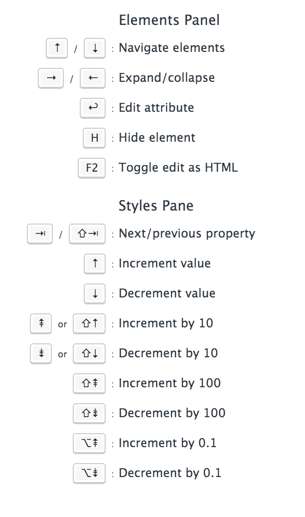 On the Elements, I really like to use the arrows in order to move between them and open/close them. Another useful key is the ‘enter’ where when you click on it, you get an option to edit the attribute of the selected element on the fly. It’s cool to test new layouts etc’.