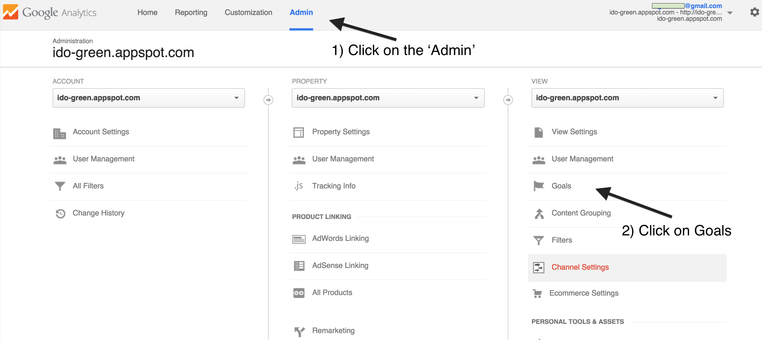 To find a view, click Admin, then select an account, property, and a view. Click Goals, then Create a Goal. You can see it in the picture below.