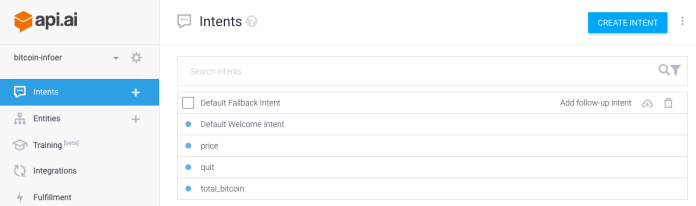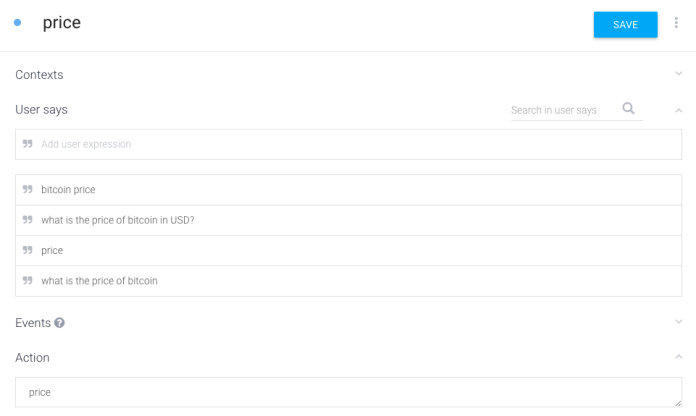 - Price intent – This intent will handle the main actions: fetching the bitcoin price.