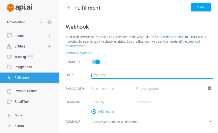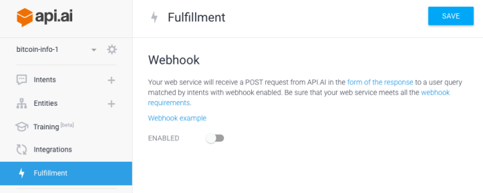 - If you don’t have a server running right now, You can use our demo live webhook: https://us-central1-bitcoin-info-io17.cloudfunctions.net/bitcoinInfo by just plug it to your Fulfilment.
