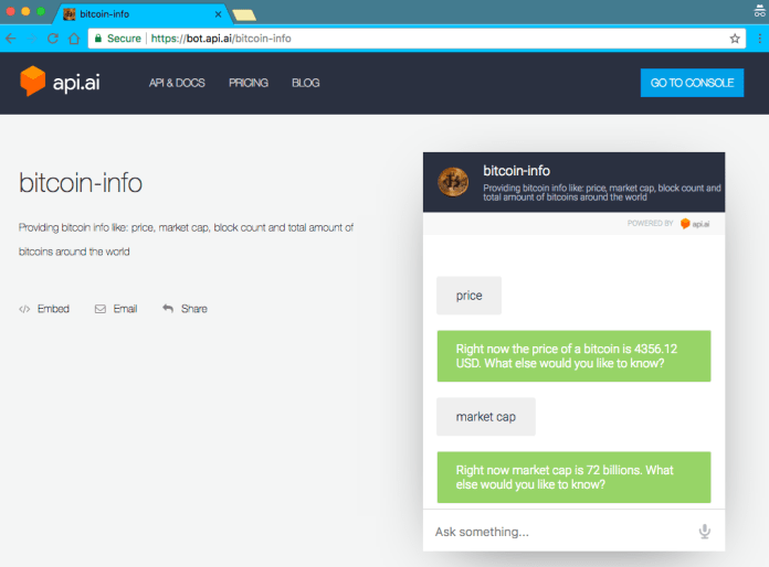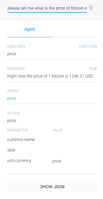 In the example below, we type “please tell me what is the price of bitcoin in USD” and as you can see it’s working nicely, since we got a price in the response.