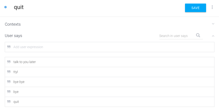 In most cases, you need to specify 10-12 phrases to train API.AI’s machine learning algorithm. Then even if the user doesn’t say exactly the words you typed here, API.AI can still understand them!
