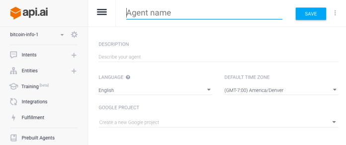 After the login you can create your first API.AI agent. Start by giving it a name and a short description as you can see in the image below.
