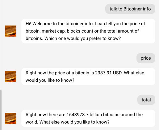 For example: “Talk to bitcoin info” is a good one because it’s specific enough and “Talk to bitcoin” or “Talk to cryptocurrency” is not good because it’s describing a category and not a specific function.