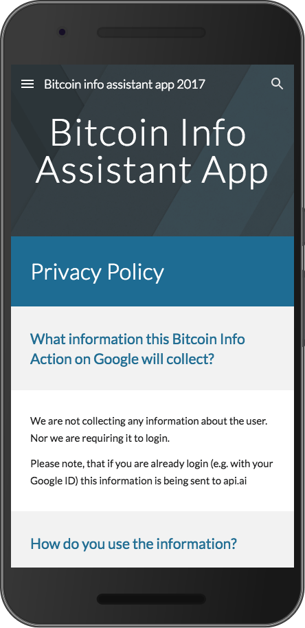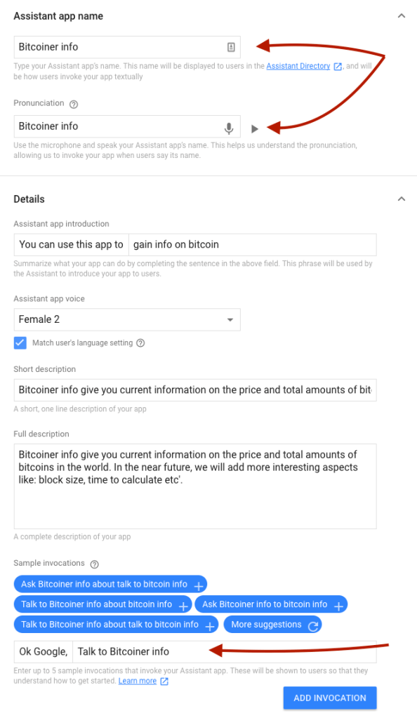 - Invocation – How the users will call your app. For example: “OK Google talk with bitcoin info”.