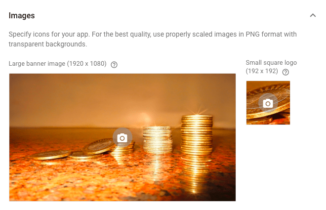 The Large banner image should be 1920 by 1080 and the Small square logo is 192 by 192.