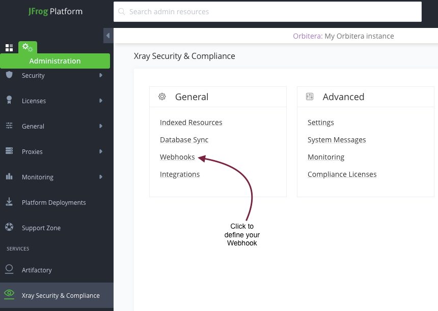 B. Open the Admin panel and under “Xray Security & Compliance” you will see the option to define Webhooks: