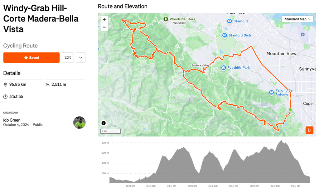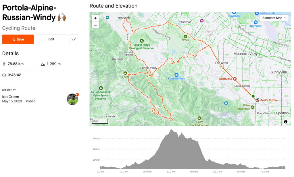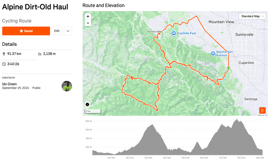 Portola Via Dirt Alpine: This loop pass in Portola Valley and takes you through some of the most beautiful gravel road in the area. The route includes some dirt roads (west alpine and windy hill), offering stunning views of the surrounding hills. If you catch a sunny day with a good visibility you can see the ocean from Russian Ridge.