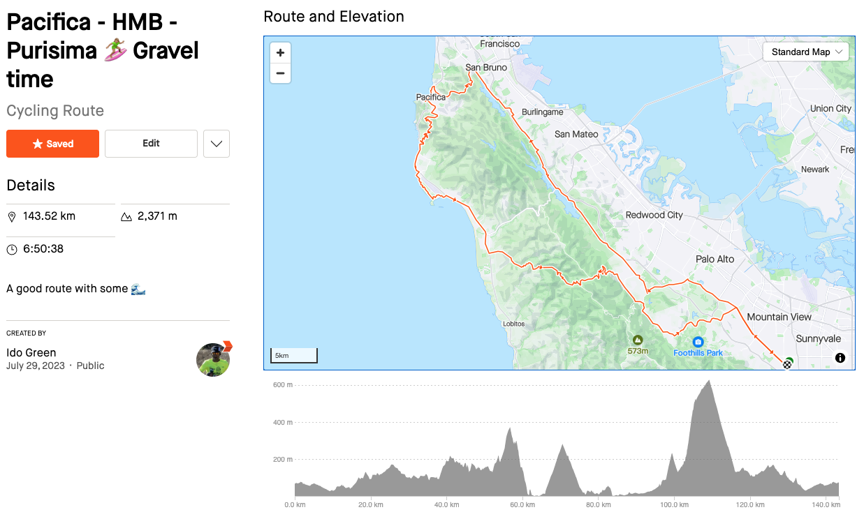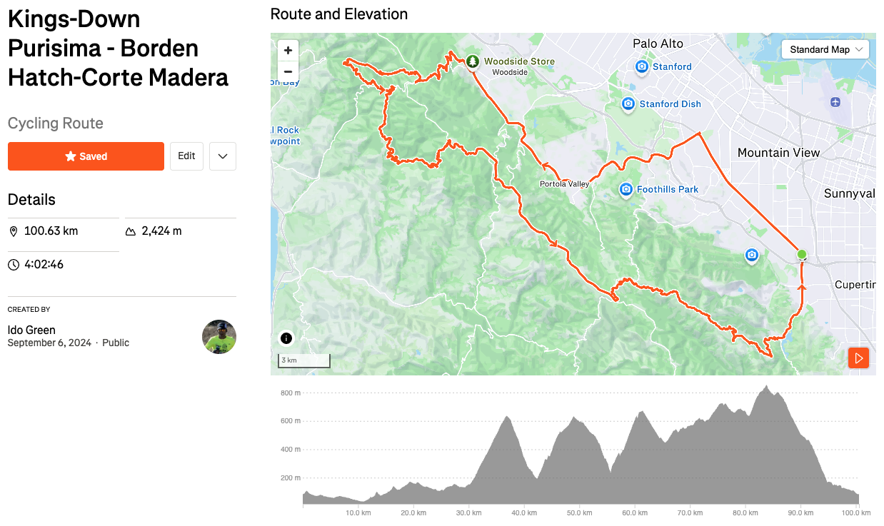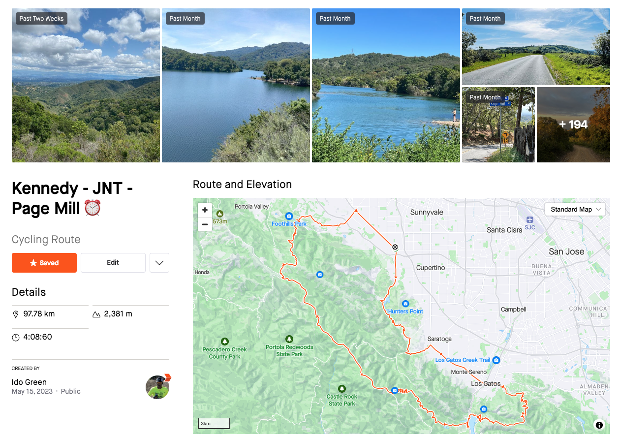 Portola Via Dirt Alpine: This loop pass in Portola Valley and takes you through some of the most beautiful gravel road in the area. The route includes some dirt roads (west alpine and windy hill), offering stunning views of the surrounding hills. If you catch a sunny day with a good visibility you can see the ocean from Russian Ridge.