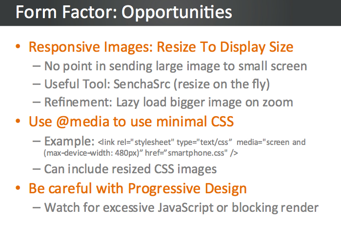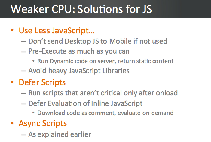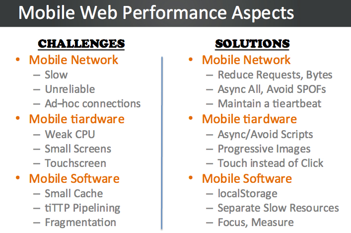 “You can’t manage what you can’t mesure” And it’s not easy to manage or get a clear picture on mobile web browsers. Since this is a very important subject to any web developer and specially those who focus on their ‘mobile first’ plan. I’ve saw this good presentation on this subject and wanted to share with you my main takes. Studies show that Mobile users expect equal or better performance than desktop, where they demand 2s load times. This is a hard requirement to fulfill, give the limitations mobile imposes. Guy Podjarny (the CTO of blaze.io) go over the different aspects of mobile: network, hardware & software. We’ll review the challenges each presents, understand how they affect web performance, and show ways to overcome those challenges. We’ll also show the impact of these optimizations on real world sites, gleaned from manipulating and measuring websites using Blaze technology. We’ll summarize with updates on the recent mobile OS releases, followed by Q&A.